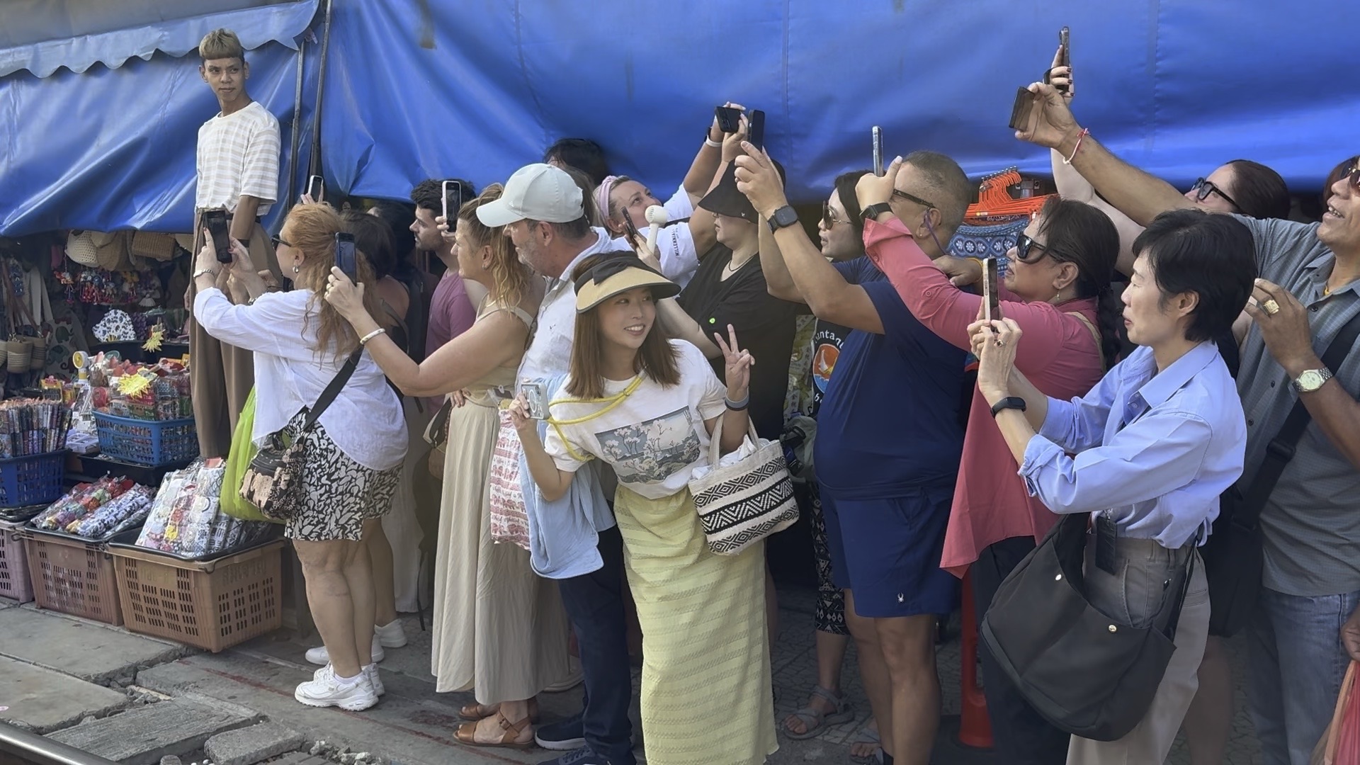 火車來臨前,當地的導遊替我拍照,拍出火車距離我很近的模樣,也拍出人潮擁擠的景象。